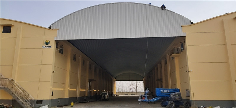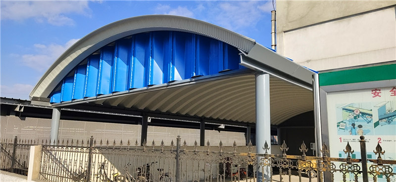 該項目采用的無梁拱形屋頂結(jié)構(gòu),外觀呈現(xiàn)海藍色,整體設計緊湊,功能齊備。施工中我們在兩側(cè)安裝了山墻封閉結(jié)構(gòu),進一步提升了整體的穩(wěn)定性和防護性能。
