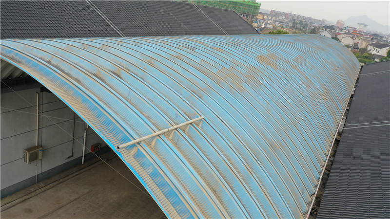 對比舊有糧庫拱形屋頂照片可以看出,舊屋頂采用海藍色板材,而新建罩棚則選用鐵青灰色彩涂板壓制。顏色和材質(zhì)的選擇均考慮了美觀性與實用性的結(jié)合,滿足了倉庫對耐久性和防護性的要求。